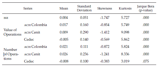 First row corresponds to logarithmic returns on the value (in constant Colombian pesos, deflated by the consumer price index) and the second to logarithmic returns on the number of operations.