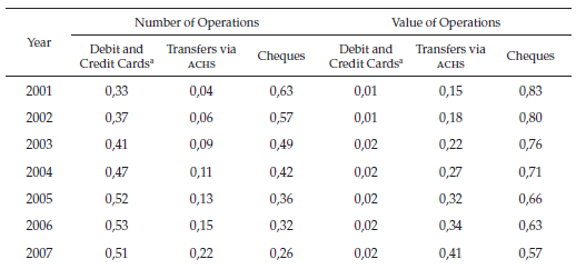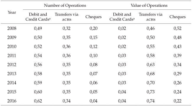 ACH Colombia is owned and managed by local banks. It fulfills the nowadays prevalent purpose of ACH s (McAndrews, 1994), namely to clear transfers between different banks regarding small repetitious payments among economic agents, such as payrolls, supplies, social security, mortgage installments, insurance premiums, dividends, and utility bills. As of 2016, twenty financial institutions clear their clients’ transfers in ACH Colombia. On the other hand, ACH Cenit is owned and managed by the central bank. Its main function is processing central government’s payments (e. g., payrolls, transfers to municipalities, public social security); thus, its main participant is the central government, which contributes with about 87 percent of its transfers by value (Banco de la República, 2017). Regarding cheques clearing, Cedec is owned and managed by the central bank as well. As exhibited in Table 7 (in the Appendix), as of 2016, payments processed in ACH Colombia, ACH Cenit and Cedec account for 96 and 38 percent of the value and number of operations, respectively, of all electronic payments cleared and settled among banks.4