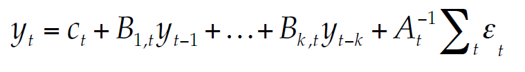 Where ct is a vector of intercepts, Bi,t i = 1,…, k correspond to matrices of coefficients, and Σt is the matrix with standard deviations, σt. In turn, Atis a lower triangular matrix with α. parameters that form a vector of coefficients, and εt is the vector of unobservable shocks with normal distribution εt ~N(0,1k ).