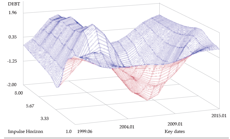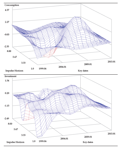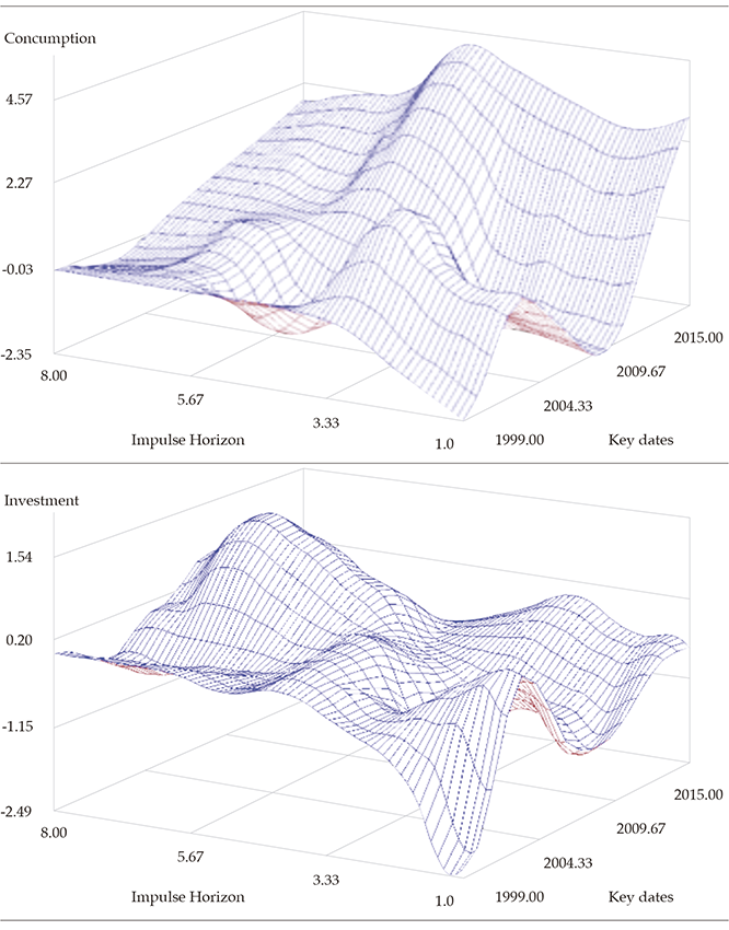 We present the time-varying impulse-response functions, which are calculated at each selected date over the sample period. Thus, the impulse responses are estimated for each iteration of the ᴍᴄᴍᴄ simulation with the current draw of the parameters, and the mean of the responses are computed.