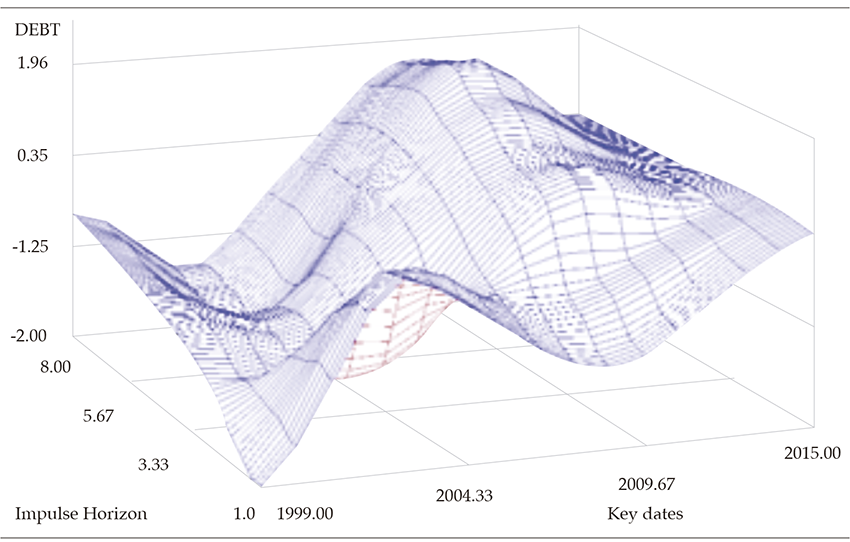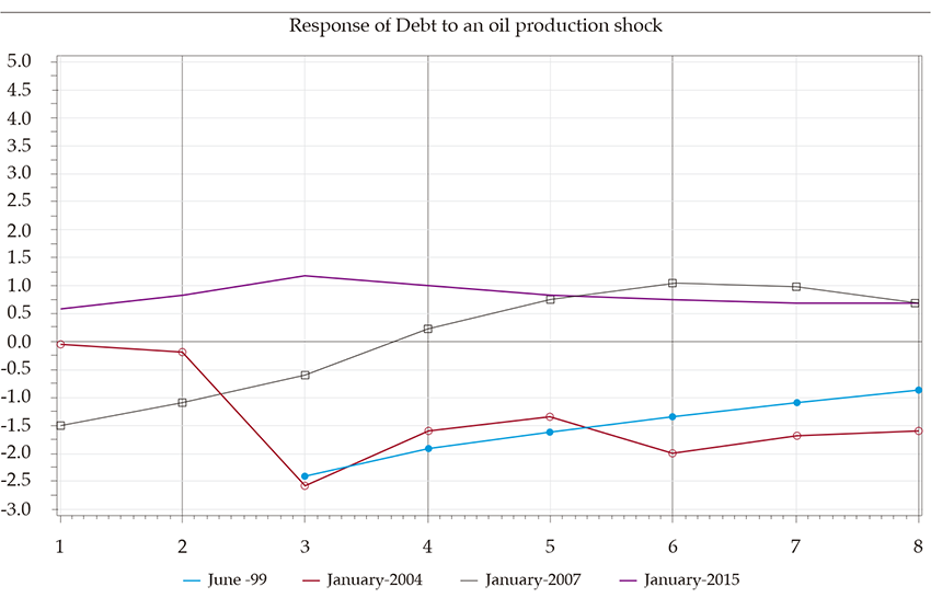 Private consumption adjusts rapidly after positive oil price shocks. The response of consumption to the negative price shock in 2015 is ambiguous, as during the first-trimester consumption drops off, but subsequently, it gradually rises. In the case of production, positive shocks generate a rapid increase in private consumption that stabilizes in the middle term. Likewise, a positive price shock leads to a reduction in public debt, except for in January 2004, when the debt increased, reaching a maximum in the third semester after the shock. We emphasize that a negative oil price shock in the last analyzed period led to an increase in public debt.