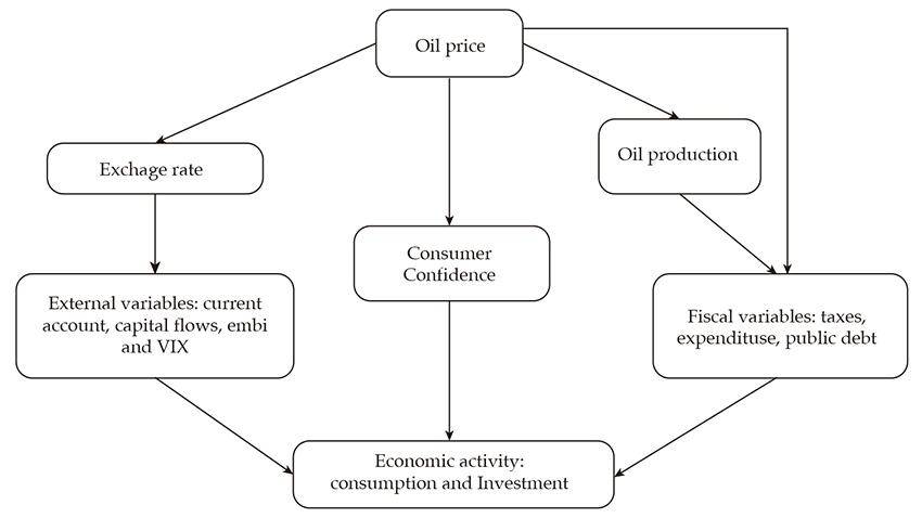 In this section, we describe the main transmission channels of oil prices and production shocks in a small open economy, considering different macroeconomic variables (figure 1). Commodities exporting countries face challenges arising from the upturn and decline of wealth due to elevated price and production fluctuations. These challenges are associated with the side effects of oil shocks on economic activity, government finances, the exchange rate, and the balance of payments.