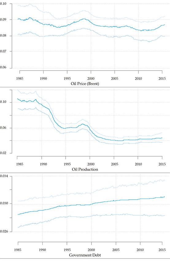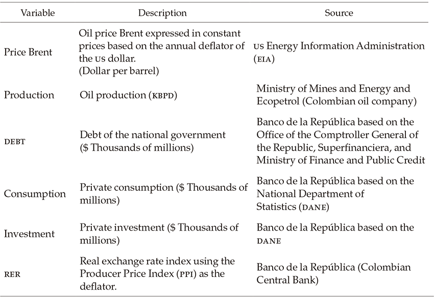 This section describes the data and presents the estimated parameters based on the ᴛᴠᴘ-ᴠᴀʀ. Bayesian program explained in Nakajima, Kasuya, and Watanabe (2011). The initial dataset consists of variables with different frequencies. Oil price and production and the real exchange rate have a monthly frequency for the period 1985M1 to 2015M12. Moreover, the government’s debt, private consumption, and investment are available with quarterly frequency for the period 1985T1 to 2015T4. Table 1 describes the variables with their respective sources.