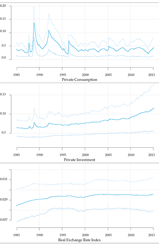 The variance of government debt shocks shows a moderate positive trend during the analyzed period. In contrast, private consumption shocks were more volatile for the 1985 to 1995 period, stabilizing at relatively low levels. The volatility of the private investment shock has risen steadily since 2009.