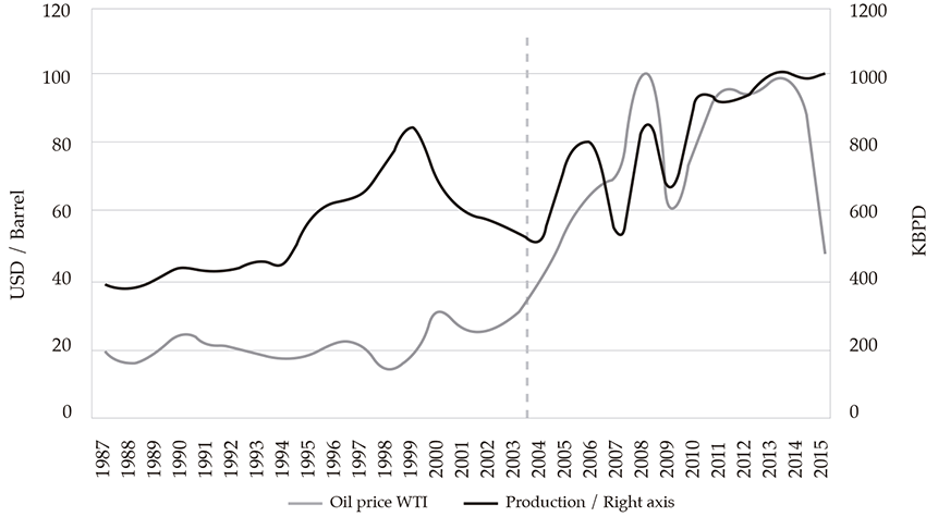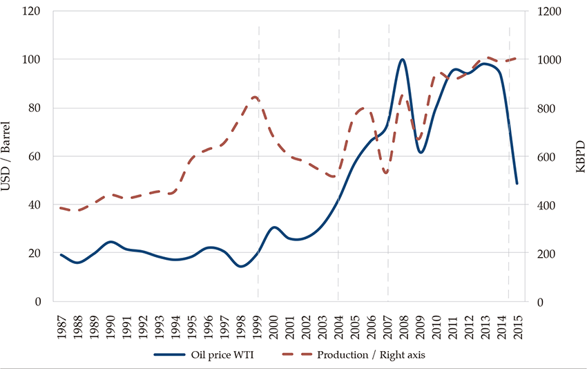 Since 2003, international oil prices have increased gradually to reach a peak of 100 usd per barrel in 2008. However, in 2009, the economic stress caused by the international financial crisis temporarily decreased the price to 60 usd per barrel, cutting off the upward trend. In the following years, oil prices recovered levels above 90 usd per barrel, until 2014, when the global increase of crude supply and the decline in the demand for commodities pushed the oil price downward. At the end of 2015, crude oil price wti reached a value of 49 usd per barrel. The spike in the oil price since 2003 encouraged oil production that, with booms and busts, gradually increased until settling around one million daily barrels per day between 2013 and 2015. The recent drop in prices has reduced oil exploration activities.