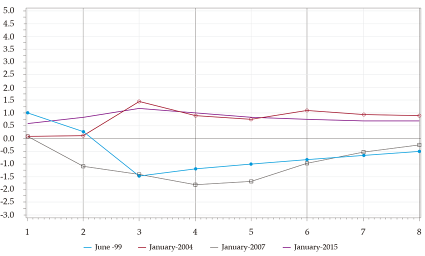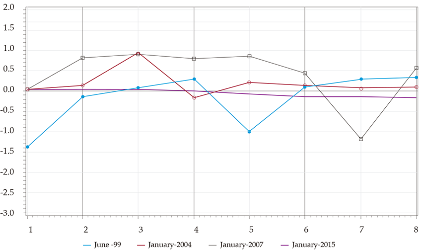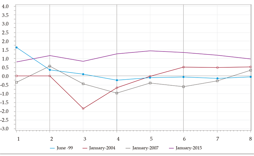 Impulse Response Functions Due to Changes in Oil-Prices for Eight Quarters and for Some Key Dates (Cont.)
