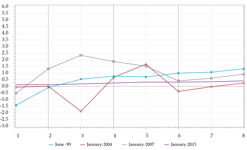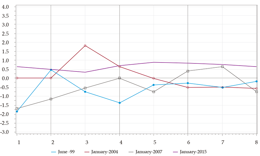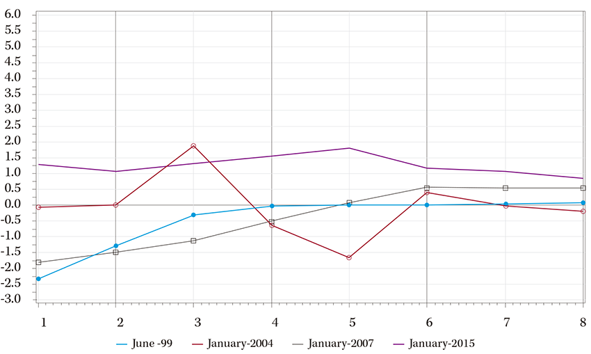 Impulse-response functions are computed for representative dates, selected based on the observed changes in oil price and production variables (figure 3). Specifically, we have selected the following dates: June 1999, January 2004, January 2007, and January 2015.3 The first date corresponds to a period with prices close to 20 us$ and daily production close to 800 kbpd. On the second, the price is growing, and production is falling to less than 600 kbpd. On the third, the price has an upward trend becoming steeper, achieving 70 usd, and production has a switching trend from downward to upward. The fourth date is characterized by a sharp price slide, which started in 2014, and stable production.