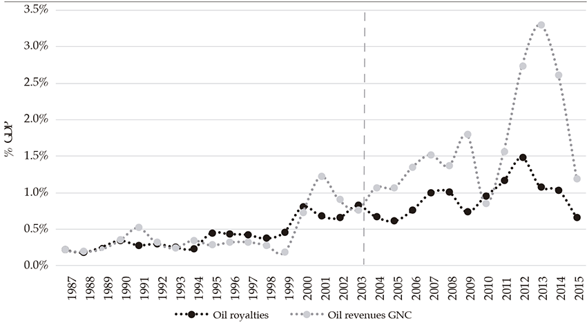 The oil boom during the last few years has produced a critical flow of resourcesto the public sector that has significantly exceeded those of the 1990s. Government revenues from oil, mainly compounded by dividends distributed by the Colombian oil company (Ecopetrol) and taxes from the sector, increased from 0.8 % of gdp in 2002 to 1.8 % gdp in 2009. After a transitory reduction in 2010, these revenues continued to grow to account for about 3.3 % of gdp in 2013 and fell to 1.2 % of gdp in 2015. Likewise, oil royalties, which constitute a source of income to regional governments, rose from 0.6 % of gdp in 2005 to 1 % of gdp in 2008. After a decline in oil royalties due to the international financial crisis, they increased to 1.5 % of gdp in 2012. According to the economic activity, the share of the oil sector in the value of production fell from 5.3 % to 3.4 % of gdp between 2001 and 2007. Later, in the boom years (2011- 2014), the share grew up to 5.6 % of gdp (appendix A).