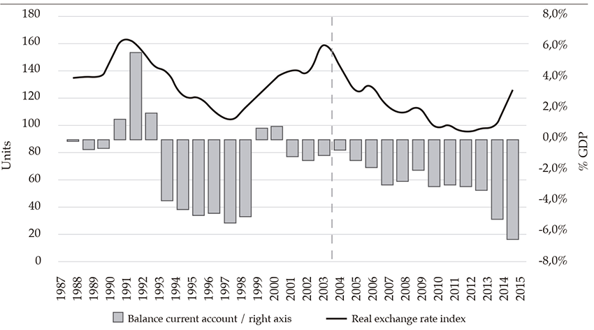 The boom leads to an adjustment of revenues and external accounts due to the increase in the value of oil exports, and capital flows from foreign direct investment. Foreign trade earnings increase the accumulation of currencies and generate a process of the real exchange rate appreciation, enhancing imports, and eroding the exports of commodities and manufactured goods, resulting in imbalances of the current account. In the middle term, the exchange rate adjustment upgrades the current account due to more expensive imports and the improvement of industrial and agricultural export goods.