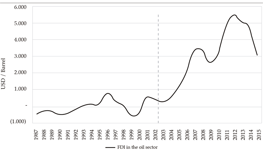 Oil became significant to the Colombian economy at the beginning of the twentieth century with the Barco and de Mares concessions granted by the Colombian state. The scarcity of capital and technology led to the transfer of these concessions to multinational companies that exploited this natural resource. During the first half of the twentieth century, most of the oil production went to domestic consumption (Perry & Olivera, 2012). At the end of the 1960s, the depletion of oil reserves was evident. Thus, it was necessary to introduce adjustments to the national legislation in order to encourage exploratory activity (Perry & Olivera, 2012). Nevertheless, in the early 1970s, Colombian oil production declined drastically, and in 1974, the country became a net importer. During the same period, international oil prices increased rapidly, from close to 3 usd per barrel in 1973 to close to 37 usd per barrel in 1980. As a result of the crisis, the Colombian government issued a regulatory framework to stimulate oil exploration in order to recover the country’s production capacity. These adjustments caused an increase in exploratory activity and foreign investment in the sector. In 1983, the Caño Limón field was discovered, which allowed for the recovery of Colombia’s productive capability, the growth of the oil reserves, the fulfillment of domestic oil demand, and the resumption of exports (Perry & Olivera, 2012).