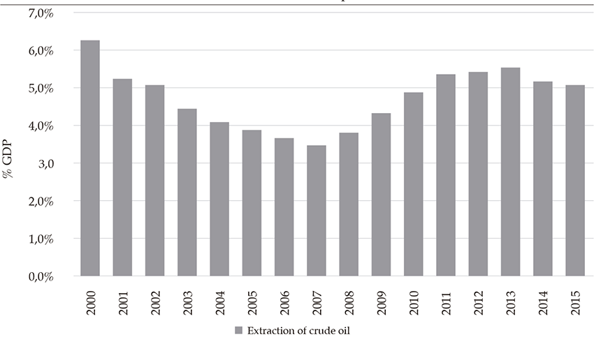 Summing up, the impact of the oil boom in recent years was bigger than that observed in the oil boom of the 1990s due to the higher international oil prices. These prices stimulated exploration, foreign direct investment in the sector, and oil production. The evolution of these variables contributed to increasing the share of oil in the total of exports to above 50 %, improved the trade terms, and generated a significant flow of public revenues to central and regional governments.