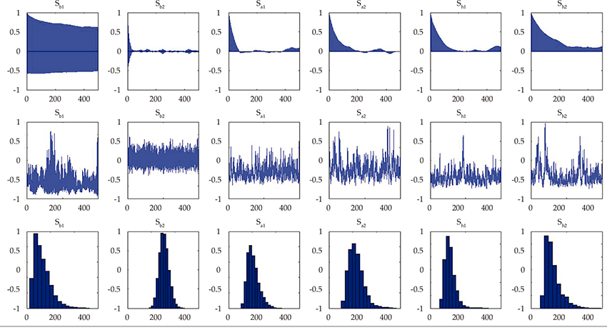 *Estimation results for selected parameters in the tpv-var model. Sample autocorrelations (top), full sample paths (middle) and posterior densities (bottom).