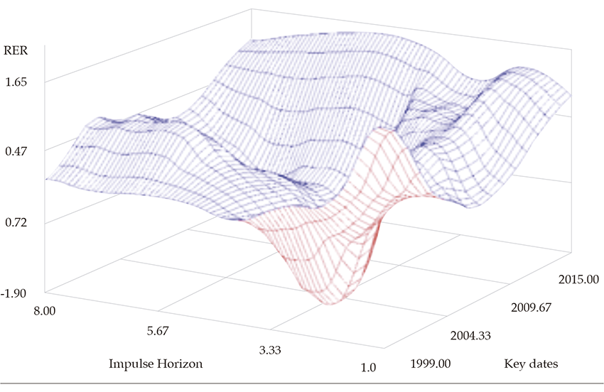 Our results indicate that the shock volatility of the analyzed variables has remained unstable during the analyzed period, indicating the relevance of using the tvp-var methodology. The impulse-response functions suggest that the real exchange rate does not respond significantly to positive price shocks, except in the case of January 2004, when there was a real appreciation. Likewise, the negative price shock in January 2015 reflects a considerable and permanent depreciation of the real exchange rate.