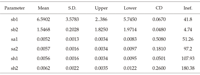 The sample autocorrelation functions, the trajectory of the sample, and the posterior density for some selected parameter functions are presented in appendix C. After disposing of the training period, it is observed that the trajectory is stable, which indicates that the chain produced non-correlated samples for almost all the parameters. Even though the autocorrelation function for the sb1 parameter exhibits a high correlation when using the full chain, it was reduced when we thinned the chain (Owen, 2017). Appendix D shows estimates of the parameters posterior mean, their standard deviations, the 95 % credible interval, the diagnosis of convergence with the cd statistic, and the inefficiency factor proposed by Geweke (1992). Based on these statistics, we failed to reject the null hypothesis of convergence to the posterior distribution.