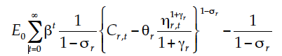Where cr,t is a consumption index, and nr,tare hours worked. The parameter σr measures the intertemporal elasticity of substitution, θr is a scale parameter, and γr the inverse of the Frisch elasticity. Those preferences were introduced by Greenwood, Hercowitz, and Huffman (1988) and have the property of muting the wealth effect on labor supply. These households maximize utility subject to the budget constraint: