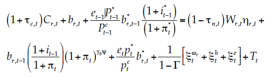The terms on the right-hand side represent sources of income, including after-tax labor income, domestic real discount bonds issued by the entrepreneurs, foreign bonds holdings, profits from unions, intermediate firms and entrepreneurs, and lump-sum net transfers, respectively. The left-hand side of the equation represents purchases in consumption including taxes and purchases of domestic and foreign assets, where following Schmitt-Grohé and Uribe (2003), the foreign interest rate