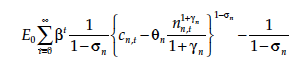 Where the sub-index n stands for non-Ricardian, cn,t is a consumption index, and nn,t are hours worked. The parameter σn measures the intertemporal elasticity of substitution, θn is a scale parameter, and γn the inverse of the Frisch elasticity.