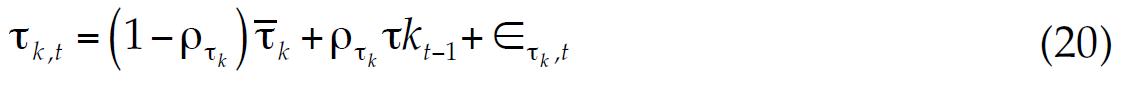 (20)Where τn, τk, and τc are long-run tax rates, ρτn, ρτk , and ρτc represent persistency, and ∈τn , ∈τk , and ∈τc are i.i.d. white noise shocks.