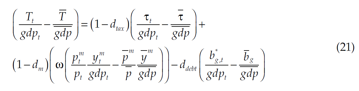 (21)So that the fiscal rule activates when the variables of interest to the government deviate from their steady-state values, and T has been set to satisfy the structural surplus budget.