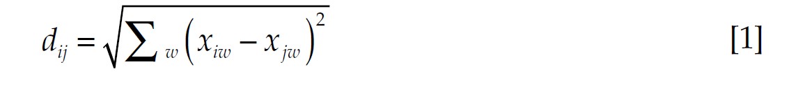 [1]The similarity between two banks, i and j, as in [1], is calculated using all the features or accounts in the financial statements. The distance between two banks (i and j) is ultimately determined by the sum of those between i and j for each w-feature. If all w-accounts, in the financial statements, are strictly the same for two banks, i and j, then dijequals 0. Also, as a byproduct of the square of differences, dij equals dij (i.e., the dissimilarity between two banks is symmetric). Finally, regarding a third bank g, the distance between i and j, dij, should be lower or equal than the sum of distances dig and dgj(i.e., dij ≤ dig + dgj).