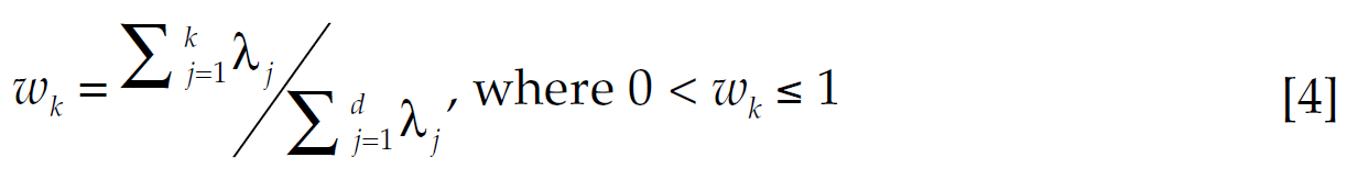 When used as a dimensionality reduction technique, the main objective of PCA is to reduce the dimensionality from d to k ≪ d while retaining most variance in the original data (i.e., without losing too much information). The fraction of variance retained when reducing the dimensionality from d to k is given by the cumulative percentage contribution of the first k-th eigenvalues to the sum of eigenvalues,