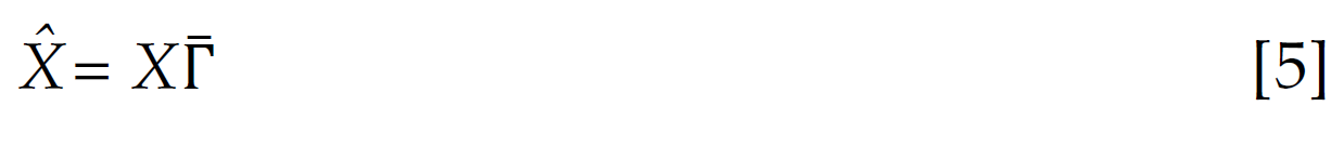 [4]Reducing dimensions from d to k yields a (d × k) matrix Γ̅ . This matrix contains the top . eigenvectors (in columns) corresponding to the first . eigenvalues from [3], with a retained variance equal to wk. From Γ̅ , a lower dimension projection of the data is attained by calculating Xˆ in [5] (see, Mehta et al., 2019). As Xˆ is a (q × k) projection matrix that retains most variance from (q × d) original matrix X, Xˆ serves as a low-dimension representation of the original dataset, suitable for feature selection purposes.