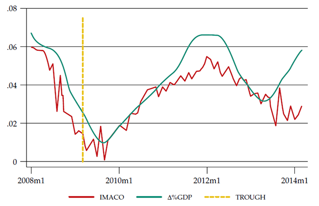 Following this approach, Alfonso et al. (2012) proposed a timing for business cycles in Colombia —updated by Arango et al. (2016). Using that timing, this paper concentrated on the cycle from January 2008 to March 2014. The trough happened in March 2009, and the recovery peak in March 2014. Figure 1 presents the Monthly Index of Economic Activity (IMACO for its acronym in Spanish), defined as “a monthly indicator constructed by the technical team of the Central Bank of Colombia based on sectorial variables, which anticipates in five months the movements of the annual gdp growth accumulated four quarters” (Banco de la República, 2019).