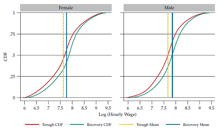 Statistical indicators in table 2 explain the shape of female and male distributions in figure 2b. Even though for female and male workforce distribution of wages at trough looks like translations to the left of the recovery wage distribution, figure 2b provides a picture of an uneven recovery process. In trough and recovery, the female hourly wage schedule can be thought as a median preserving spread of the male one —i.e., female hourly wages have the same median as male ones, but the first exhibit higher variance (table 2).