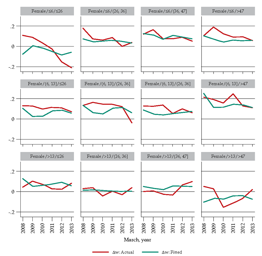 Figures 5c and 6c support the hypothesis of skills updating, acting as a secular factor affecting fluctuations of the wage distribution in a particular cycle (Barlevy & Tsiddon, 2004). Even tough table 4 shows the percentage of total change associated with attributes drops, since 2011, the secular factor shapes the trend at the beginning of the recovery phase.
