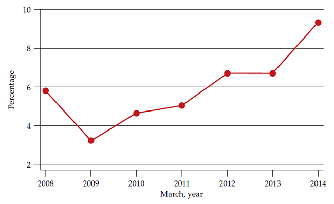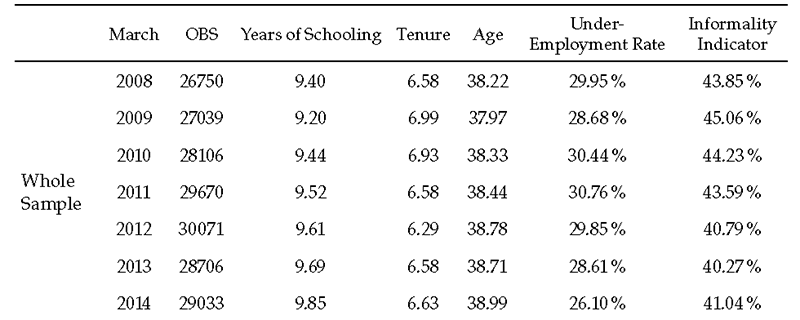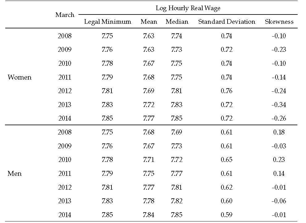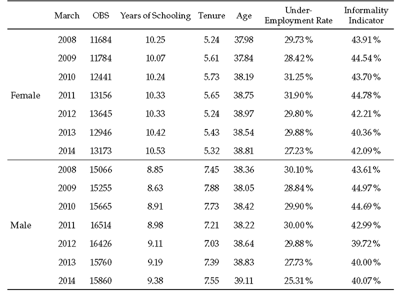This paper uses data from the Large Integrated Household Survey (geih for its Spanish acronym) to analyze changes in the distribution of hourly wages in Colombia from 2008 to 2014. To make sample reporting comparable, I used each year’s March geih ameliorating seasonal effects and wages’ misreporting —workers reported previous year wages during January and February, inducing overestimation of decreasing wages. Relatively large samples of workers are available to estimate changes in the distribution of hourly wages along the cycle. The sample sizes are approximately 29 000 workers per month, which are intended to be representative of the Colombian labor market. Table 1 clearly presents the differences in attributes between female and male workforce. Using the percentage of the workers earning less than the legal minimum wage as an indirect measure of informality, it is possible to suggest that informality is procyclical. Improvements in formality emerge from the recovery; nonetheless, those improvements are unevenly distributed across female and male segments of the labor market.