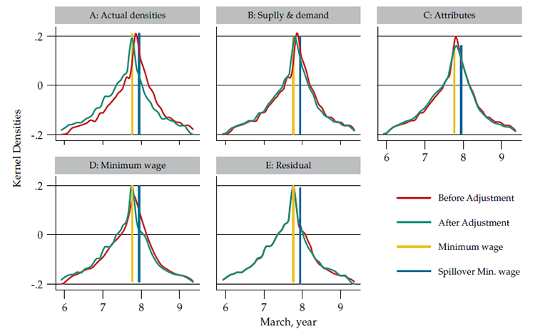 The differences between those series are intended to account for the wages’ component by cell, which is orthogonal to cyclical demand and supply cell factors, and the broad indicator. By discounting the estimated change in wages, it is possible to compare findings on the relative importance of minimum wages with the rest of the literature that has focused heavily on supply and demand, by neither overstating the importance of factors nor ignoring supply and demand considerations.