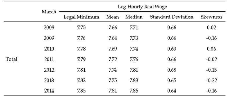 One reason for the relevance that minimum wage takes during a business cycle is the fact that it implies some degree of wage stickiness and, as a consequence, a more volatile income distribution (Quadrini & Ríos-Rull, 2014). As Mondragón and Peña (2012) pose, the formal sector cannot respond to cyclical fluctuations because of the presence of market rigidities linked to minimum wages. In Colombia, the minimum monthly wage is the fiftieth percentile of the monthly wage, but it is lower than the mean monthly wage. In the approach proposed here, the minimum hourly wage defines a cutoff to look for changes in the bottom of the distribution and to understand the role played by informal-formal interactions in shaping this bottom.