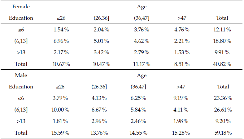 (1)Where wt is a measure of aggregated real wages, and Ct is a cyclical indicator (see Arango et al., 2016, for Colombian the case.) Nevertheless, over the cycle, demand and supply changes and firms’ responses to cyclical innovations that may not be synchronized are experienced. Thus, there will be changes in the composition of the employed workforce during the cycle. To catch up those effects, this paper divides the workforce into 24 gender-education-age cells. Thus, each cell encapsulates male and female workforce by a measure of potential experience. Table 3 shows data composition for the total workforce (unemployed and employed) and the way cells are defined.