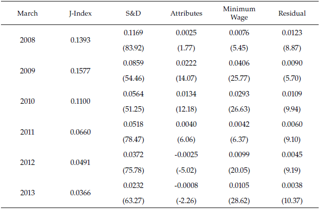 Up to here, results confirm the importance of cyclical supply and demand factors in shaping wage distribution in the cycle (figures 5b and 6b), even if the divergence between distributions is slight (table 4). As expected, J-index decreases as the economy reaches the recovery, but supply and demand still are the main factors in the decomposition. Firms’ wage policy is updated by incorporating cell responses to aggregate component of the cycle, and demand and supply adjustments. Remember that, first, each cell encapsulates male and female workforce by a measure of potential experience, and, second, female hourly wage schedule can be thought as a median preserving spread of male one; thus, wage policy updating induces an uneven recovery process. This result contrasts with evidence suggesting that female earnings are non-responsive to macroeconomic developments (Blank, 1989).