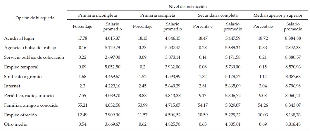 La tabla 2 describe los métodos de búsqueda utilizados a partir del nivel de instrucción de los trabajadores. Es posible ver que las personas de mayor nivel educativo accedieron a los salarios promedio más altos mediante servicios públicos de colocación e Internet, mientras que los menos escolarizados obtienen los mayores ingresos promedio a través de bolsa de trabajo o programas de empleo temporal del Gobierno. La opción de empleo temporal aparece como la alternativa menos recurrida, en prácticamente todos los niveles de instrucción, en tanto, la de menores ingresos es el servicio público de colocación para los ocupados de baja escolaridad y, bolsa de trabajo para media superior y superior. Cabe señalar que, en todos los niveles de instrucción, más de la mitad de los trabajadores consiguió su empleo por medio de un familiar, amigo o conocido.2 Estos resultados apuntan a que la bolsa de trabajo e Internet, permiten salarios elevados tanto para los no calificados como para los calificados, con la excepción del servicio público de colocación para los de mayor instrucción.