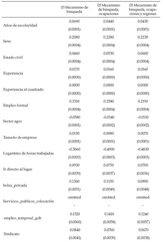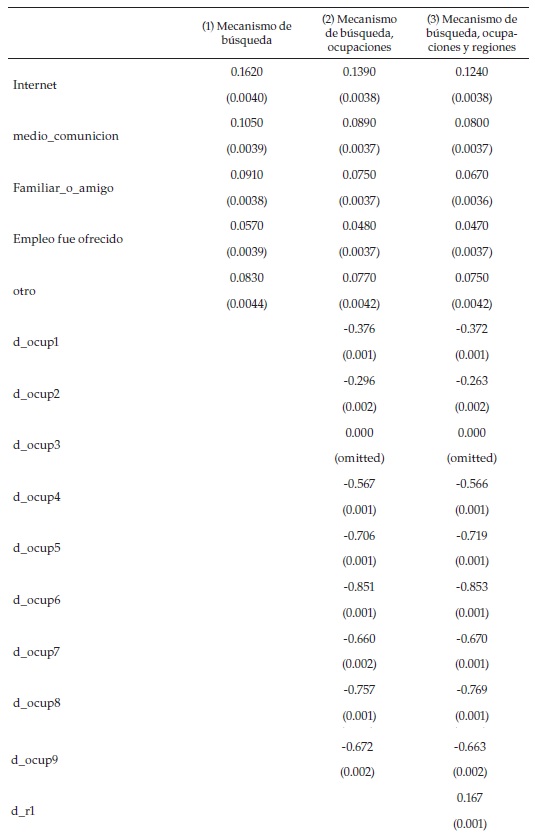 Los resultados de la regresión por mco, favorecen la hipótesis de que haber encontrado empleo por medio de amigos y conocidos está correlacionado con una mayor remuneración. La primera estimación describe un incremento del 9.1 % en el salario de los trabajadores a partir de haber encontrado empleo mediante su red de contactos. Sin embargo, no es el medio que mayor prima salarial ofrece. Encontrar trabajo a través de Internet incide un 16.2 % en los ingresos adicionales, seguido de empleo temporal del gobierno (15.2 %) y bolsa privada (13.6 %). La variable servicio público de colocación fue la variable omitida para evitar perfecta multicolinealidad.