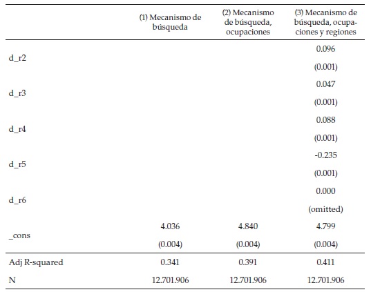 [2]Donde y es el logaritmo natural del salario por hora trabajada, S es la escolaridad de los individuos, E representa la experiencia potencial del trabajador,3 la variable dicotómica m_busq representa el método de búsqueda a través del cual el trabajador consiguió su actual empleo: acudir directamente, mediante una bolsa privada, servicio público de colocación, sindicato, Internet, medios de comunicación, redes de contactos, ofrecimiento por parte de la empresa y otro. Por su parte, X es un vector de variables referentes a características sociodemográficas de los individuos que inciden en la determinación salarial. Empíricamente, el modelo desagrega S en niveles de instrucción, esto es, S = S1, S2, S3, S4, siendo en ese orden: primaria incompleta, primaria completa, secundaria completa, y media superior y superior.4 Por su parte, u es la perturbación aleatoria con media cero y varianza constante. Respecto a los controles econométricos en cada estimación, se incorporan variables dummy de ocupación y de región; en el primer caso con base en el Sistema Nacional de Clasificación de Ocupaciones (sinco),5 y en el segundo, considerando la regionalización de Hanson (2003).