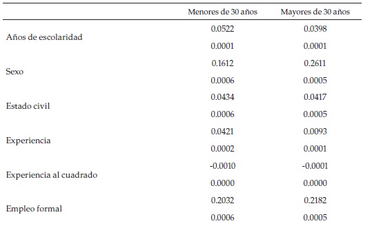 El 60 % de la población mexicana que usa Internet se ubica en un grupo poblacional entre los 6 y los 34 años de edad, de acuerdo con estimaciones propias. En la tabla 4 se aprecia que los años de escolaridad tienen mayor impacto en el salario de las personas más jóvenes. De la misma manera, contar con mayores años de experiencia siendo menores de 30 años, representa un factor relevante para un mejor salario. Ello apuntaría a que entre más jóvenes se integren las personas al mercado laboral, mejores posibilidades tendrán de tener un ingreso elevado a edad temprana. La formalidad en el empleo paga prácticamente igual a los dos grupos de edad. En referencia a la variable de interés, se aprecia que haber encontrado empleo gracias a los contactos, reporta una prima salarial mucho mayor entre las personas mayores de 30 años, 8.6 %, comparado con el primer grupo de edad, 0.1 %. La comparación por edad destaca al Internet como un medio de búsqueda de empleo crucial para alcanzar salarios elevados entre los jóvenes, representando una prima de 16.4 %. Para las personas mayores de 30 años el premio al salario por usar Internet como medio de búsqueda fue de 9.6 %.