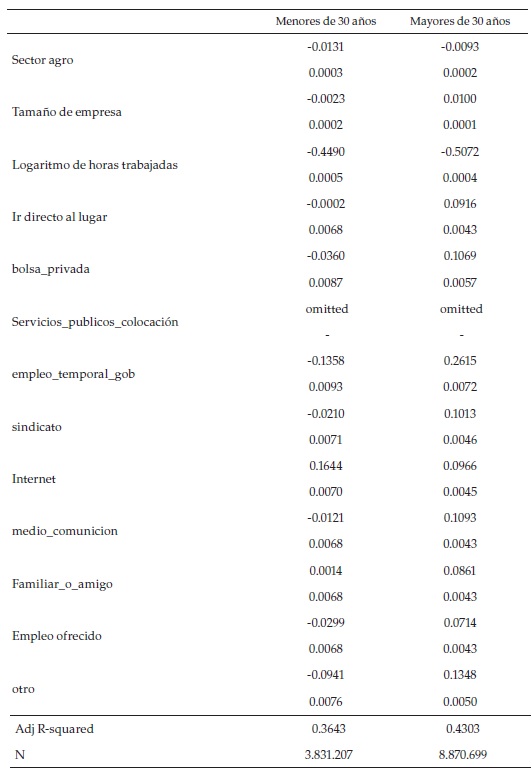 En la tabla 4 se evalúan efectos diferentes del mecanismo de búsqueda de acuerdo a la edad, puesto que el uso de computadoras e Internet es predominante en la población joven (Torres & Félix, 2017), lo cual tendría implicaciones en la elección del instrumento de búsqueda de empleo. En México, de acuerdo con la Ley del Instituto Mexicano de la Juventud, se considera joven a un individuo cuya edad comprende entre los 12 y 29 años, por lo cual, para efectos de esta investigación los individuos por debajo de los 30 son jóvenes, y aquellos con edades iguales o superiores a este valor, son considerados adultos.