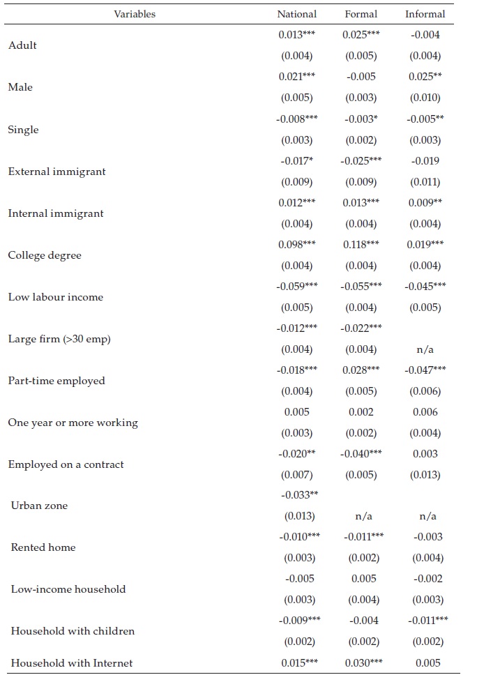 [2]Where Ii is the teleworkable indicator for the ith individual, Z is a set of covariates that characterise the workers and their households, and Dk is a set of regional and sectoral dummies. In order to identify possible effects of informality within the population, three sets of regressions were again estimated: at the national level, with formal workers, and containing informal workers.