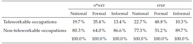 Table 2 shows a comparison of the estimated proportions of teleworkable occupations for Colombia based on O*net, using the task content of us occupations and step, based on Colombian tasks information. The results show that both methods coincided with 84.3 % (70.9 % + 13.4 %) of their occupational task classifications for workers in Colombia.
