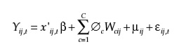 (3)Donde Wcij es una variable dummy que toma el valor de 1 si el hogar i de la ciudad j es miembro de la cohorte c, y de 0 en caso contrario. Reemplazando (3) en (1):