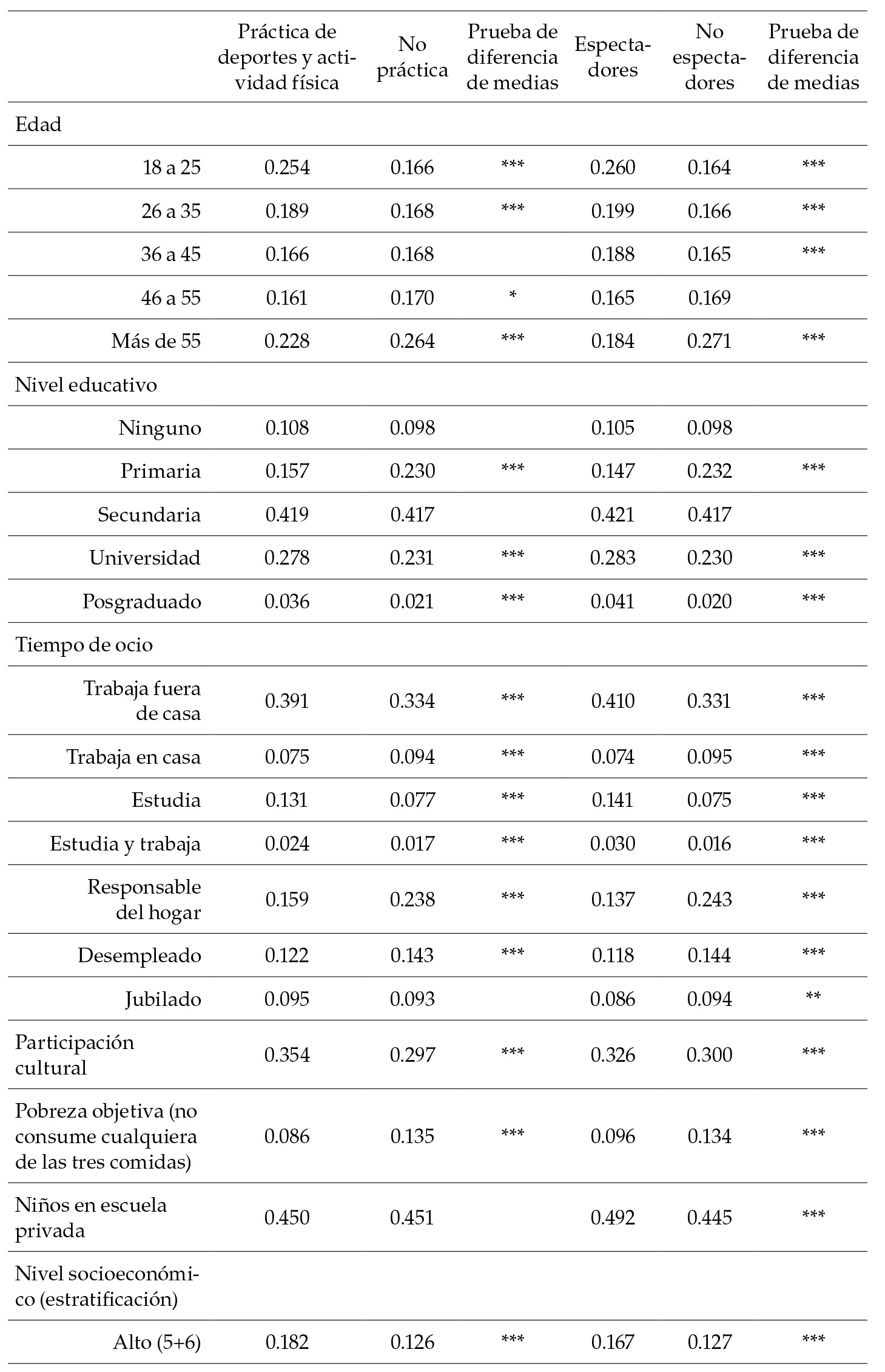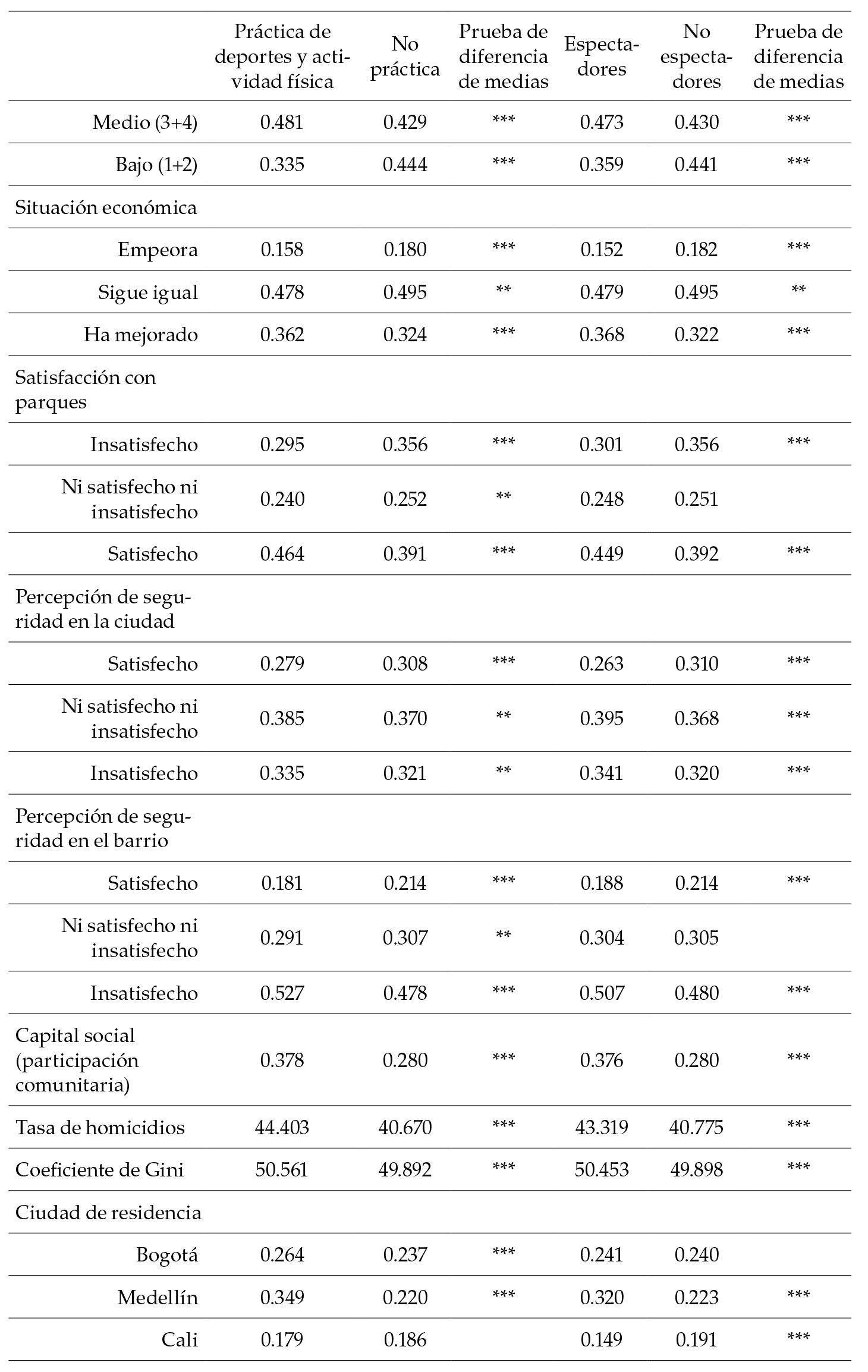 Sports have become a central activity for the quality of life and a remarkable mobilizer of financial resources. This research analyzes the factors associated with the decision to participate in sporting activities in Colombia’s five main cities between 2008 and 2015. With microdata from Colombian households, we estimated two probit models applied to a pseudo-data panel: one for practitioners of physical and sporting activities and one for spectators. Income and time availability, and, especially, structural factors such as gender, stratification, poverty, and social capital explain the wide gaps in access in Colombia’s main cities.