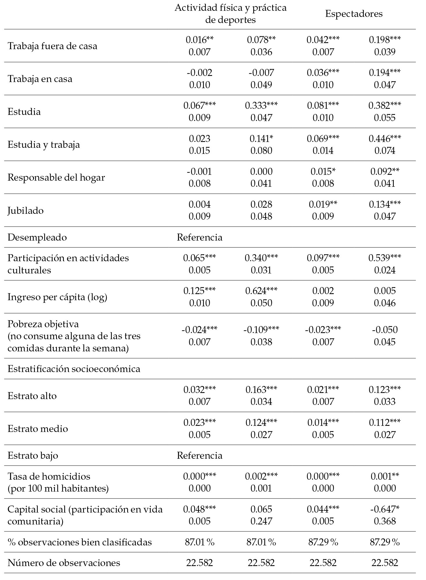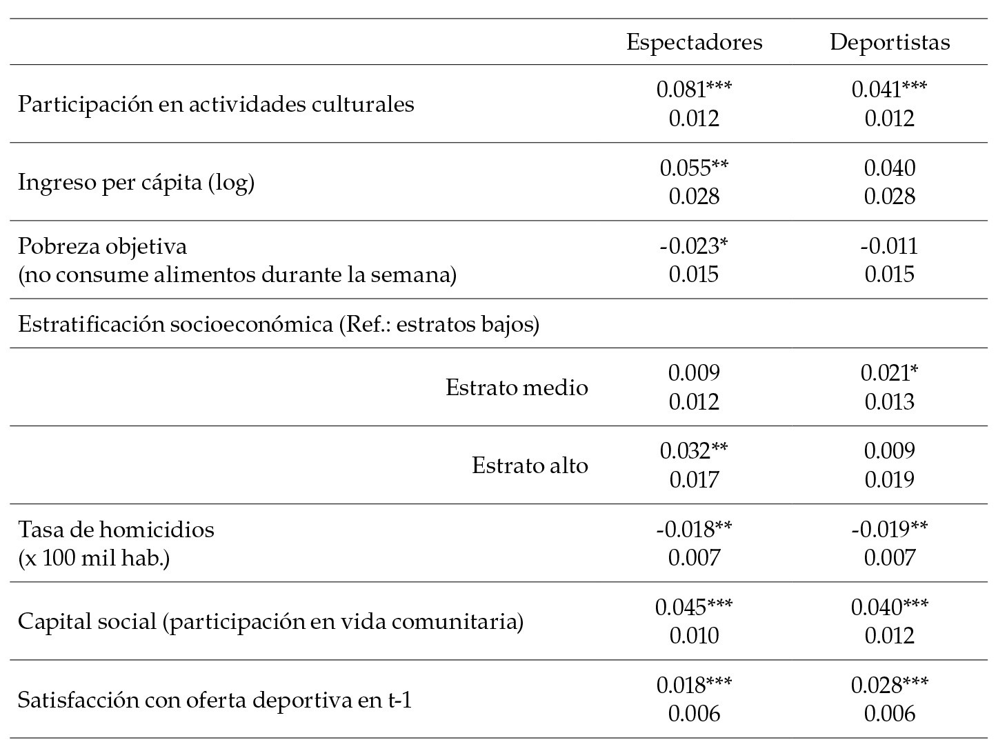 En general, los dos modelos muestran resultados esperados en cuanto al signo de los coeficientes estimados (efectos marginales) y la significancia estadística de las variables tradicionales de los modelos de demanda deportiva: el sexo, el uso del tiempo de ocio, los ingresos y la educación (una variable cultural usualmente incluida como determinante). Igualmente, son consistentes los estimadores de los factores estructurales contemplados: la pobreza, la estratificación, la seguridad, y el capital social.