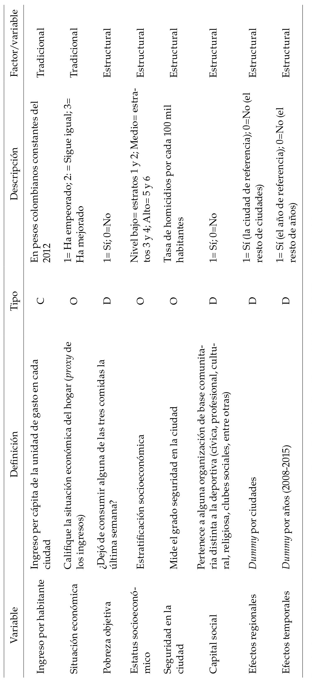 Entre los factores estructurales, los más relevantes son la posición socioeconómica de los hogares, que en Colombia se puede expresar mediante la estratificación,4 y la pobreza objetiva medida a través de la falta de alimentos (tabla 1). Otros factores estructurales pertinentes al análisis son los efectos regionales y temporales relativos a la ciudad tratados a través de la metodología del pseudo-panel, el capital social involucrado en la vida comunitaria y, la seguridad de las ciudades (tabla 1).