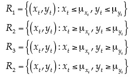 Intuitivamente, se puede interpretar a un régimen económico como un comportamiento particular en términos cualitativos que se diferencia de otros. Para este caso, cada régimen corresponde a una performance económica particular, diferenciada de los otros regímenes. En este caso, la partición elegida está determinada por los promedios anuales de la tasa de crecimiento del pib per cápita (μxt) y de las emisiones de co2 per cápita (μyt). Se debe tener en cuenta que la elección de estas medidas utilizadas para la determinación de los regímenes es exógena, y por ende, los resultados dependen de estas. Para cada año t (con t = 1, …, 64) se definen las medias de la tasa de crecimiento del pib per cápita y de las emisiones de co2 per cápita: