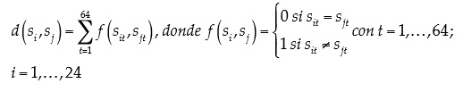 Una vez realizada la simbolización —habiendo obtenido las series simbólicas que dan prueba de las trayectorias dinámicas cualitativas de los países en términos de emisiones de co2 y crecimiento económico—, es posible introducir una noción de distancia (véase Tang et al., 1997; Molgedey & Ebeling, 2000; Piccardi, 2004) que permita analizar la similitud en el comportamiento de los países y estudiar la existencia de grupos de países con dinámicas semejantes. La distancia entre dos países i y j se define como: