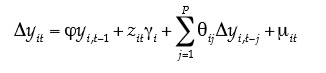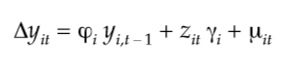 Adicionalmente, se estudiará el orden de integración de los procesos considerados a partir de la prueba propuesta por Im, Pesarán y Shin (2003), que hace una nueva versión de lo anterior, dando la flexibilidad de considerar diferentes estructuras paramétricas dentro de las unidades del panel y un mejor ajuste a las conclusiones halladas. La ecuación (2) muestra analíticamente esta alternativa.