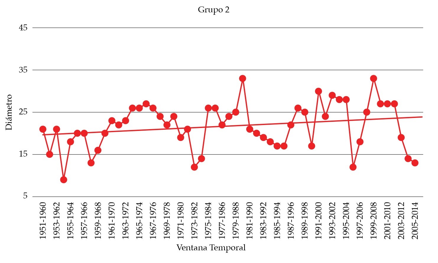 Para el estudio de la convergencia entre los grupos, se calcula el diámetro del mst (definido como la suma de enlaces entre los países), para cada grupo y para el total de los países, considerando ventanas temporales solapadas de 10 años cada una. Esto permite analizar la evolución del diámetro del mst, dando una aproximación a la potencial convergencia entre los países considerados (si el diámetro disminuye en el tiempo). Se observa que durante todo el periodo la trayectoria del diámetro de la muestra completa parece estable (a pesar de observarse una muy leve tendencia creciente). Sin embargo, considerando ambos grupos por separado, se observan distintos comportamientos. En cuanto al grupo de bajos niveles de emisiones, los países que lo conforman no parecen distanciarse. Por otra parte, observado el grupo de altos niveles de emisiones se encuentra que los países parecen estar más distanciados entre sí, en tendencia, dando lugar a dinámicas disímiles en el tiempo entre ellos. Adicionalmente la dinámica de evolución de las distancias parece tener una menor variabilidad si se la compara con la del primer grupo (véase figura A3 en el Apéndice).