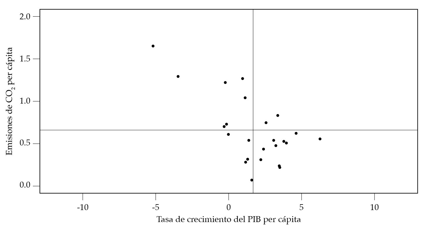 (1)Al aplicar el criterio de partición definido con anterioridad, la figura 1 muestra la dispersión en el espacio de los puntos correspondientes al nivel de tasa de crecimiento del producto real per cápita y las emisiones de co2 per cápita para el 2014, a modo de ejemplo para cada uno de los 24 países.
